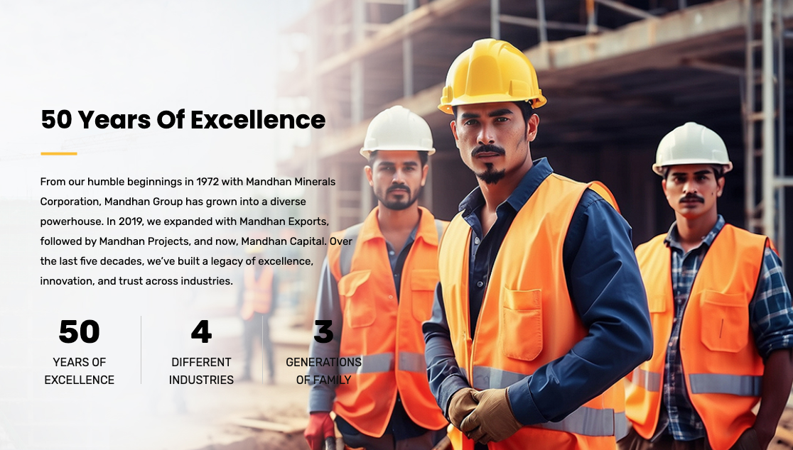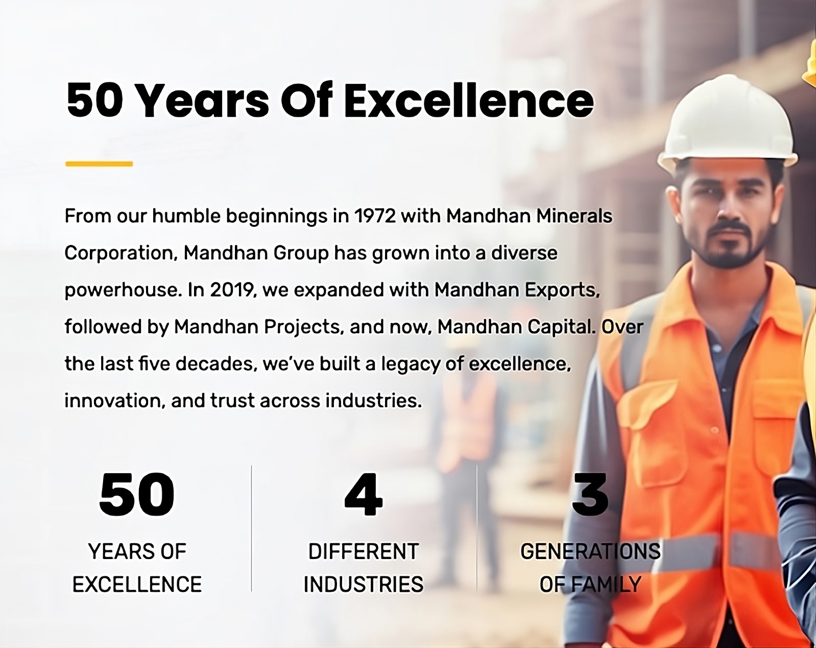 From our humble beginnings in 1972 with Mandhan Minerals Corporation, Mandhan Group has grown into a diverse powerhouse. In 2019, we expanded with Mandhan Exports, followed by Mandhan Projects, and now, Mandhan Capital. Over the last five decades, we’ve built a legacy of excellence, innovation, and trust across industries.
